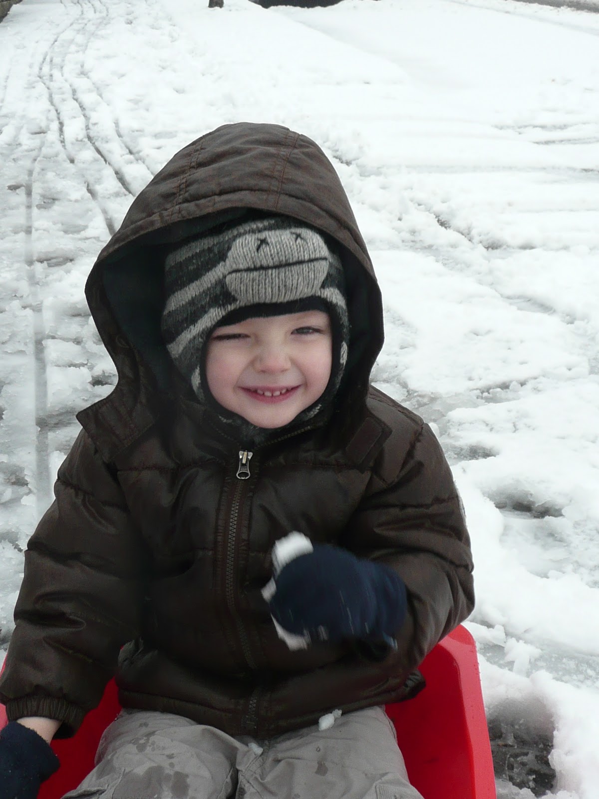 Well we woke up on Saturday morning to find that snow was falling! It was a bit of a surprise all round, but fortunately, although we had two inches, it was nearly all melted by this lunchtime. Alex's cough and cold are so bad at the moment that the poor little boy was shattered so yesterday was an exceedingly difficult day with him as he spent most of the time being completely irrational. Luckily for me, by the time I was due to take him out in the afternoon he had calmed down somewhat and was being more fun, so he spent time throwing snowballs at me and having fun with the sledge.