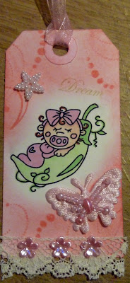 This weekend it is also time for the first QUIRKY CRAFTS challenge of the year. The theme was chosen by Lyn of Something New with pink. We have two sponsors this week, Bugaboo and Doodle Dragon. I was given a cute little image called 'Peapod Boo' to work with so I used her on a New Baby tag. I inked all around her with distress ink, then stamped swirls with an inkadinkado stamp. I added the word 'Dream' using a crafty individuals stamp and then added various embellishments from my stash (lace, flowers, star and butterfly). I am entering this into MTTC 'All about the new', Flutterby Wednesday 'In with the new', Simon Says Stamp 'new something', and Cute card Thursday 'something new'.